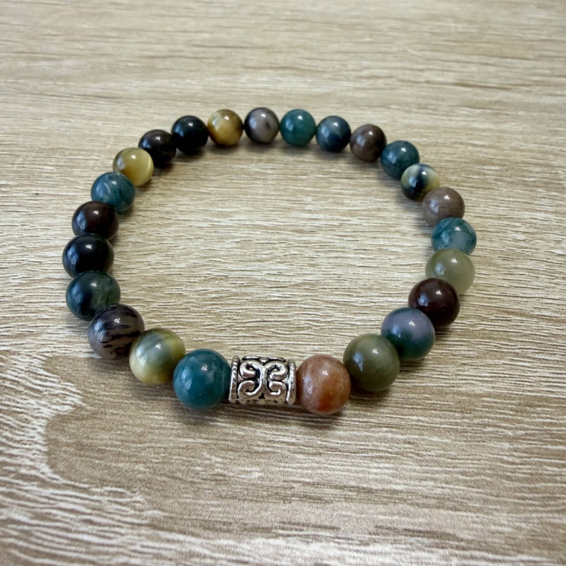 Achát machový + Sokolie oko + Tigrie oko + Skamenelé drevo - PÁNSKY náramok (Ø gul. 8 mm)