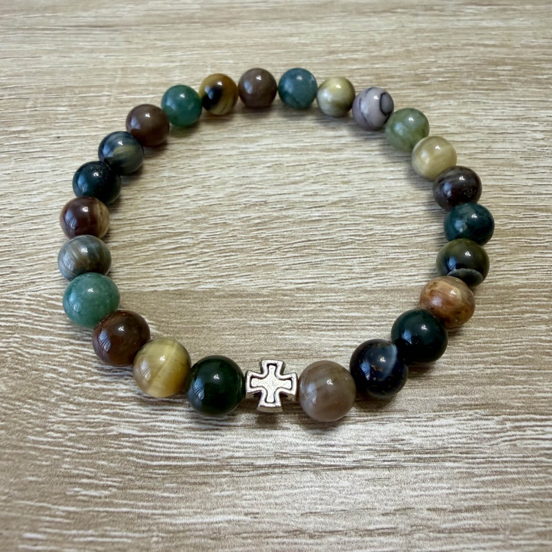 Achát machový + Tigrie oko + Sokolie oko + Skamenelé drevo - PÁNSKY náramok s krížikom (Ø gul. 8 mm)