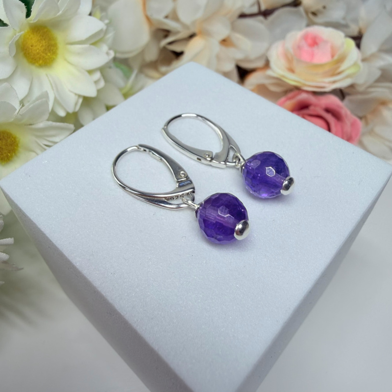 Ametyst (fazetovaný) - visiace náušnice v striebre (Ø gul. 8 mm)