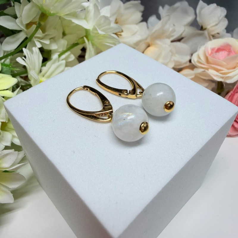 Mesačný kameň (biely) - visiace náušnice v pozlátenom striebre (Ø gul. 10 mm)