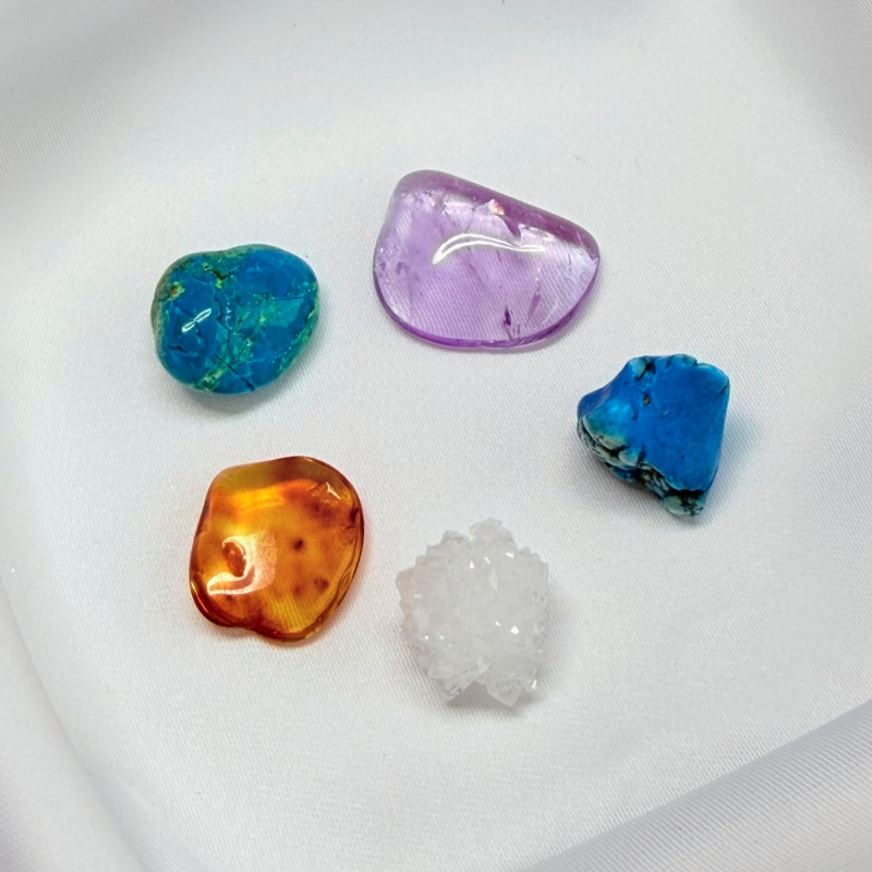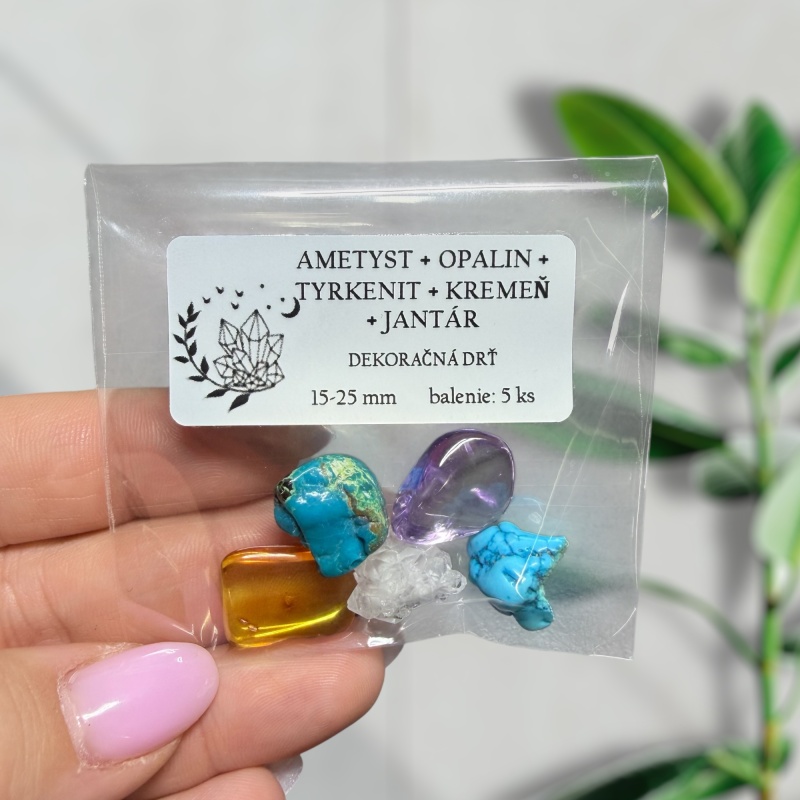 MINI ZBIERKA (Ametyst+Opalin+Tyrkenit+Kremeň+Jantár) (15-25 mm) - balíček tromlovaných kameňov - 5ks/bal.