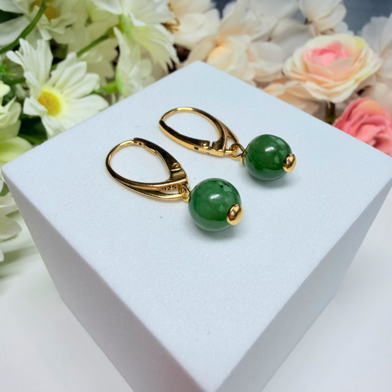 Nefrit - visiace náušnice v pozlátenom striebre (Ø gul. 8 mm)