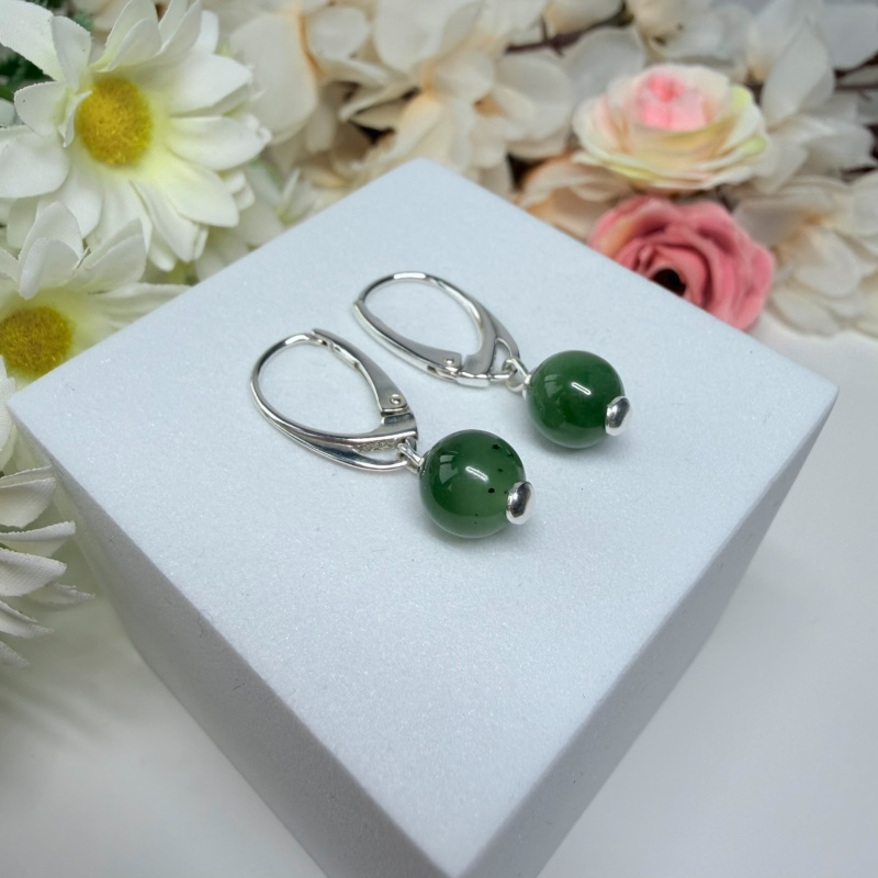 Nefrit - visiace náušnice v striebre (Ø gul. 8 mm)