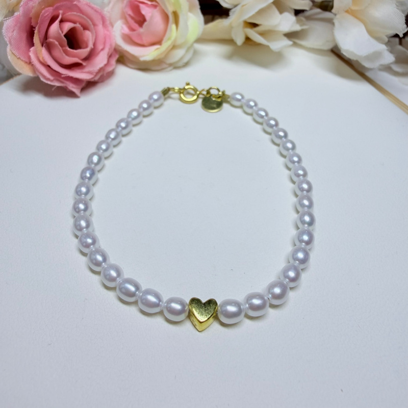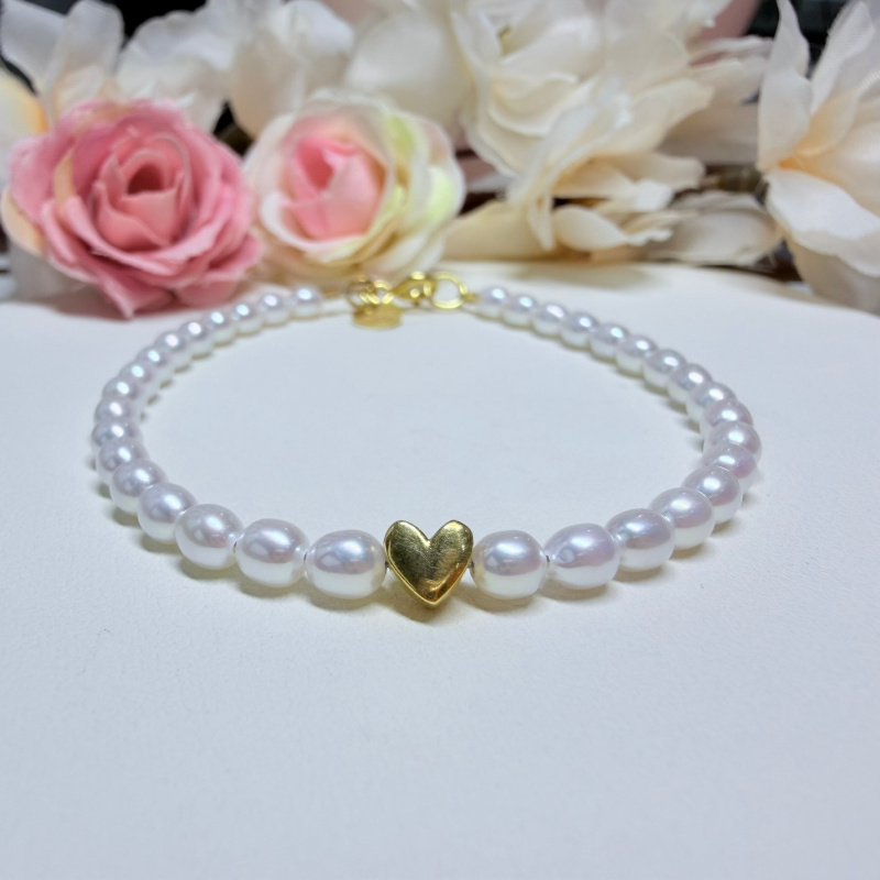Perly sladkovodné - náramok so srdiečkom 17.5 cm (Ø perly 4 mm)