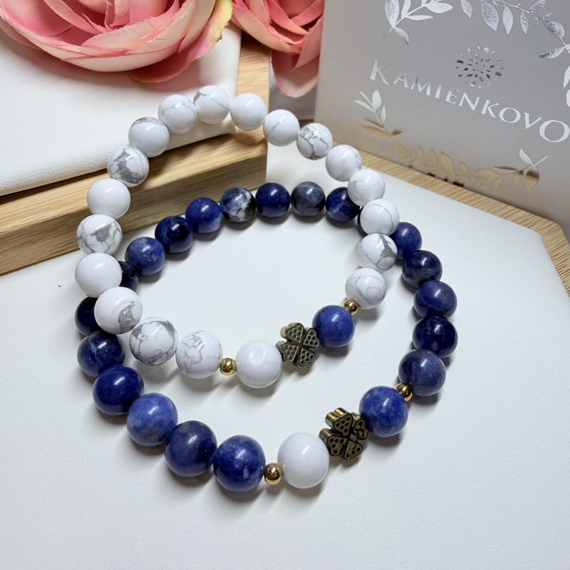 Magnezit + Sodalit - PARTNERSKÉ náramky so štvorlístkom (gul. Ø 8 mm)