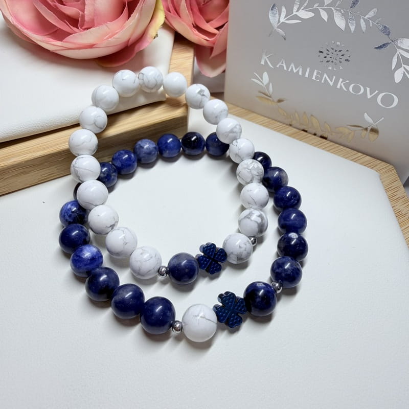Magnezit + Sodalit - PARTNERSKÉ náramky so štvorlístkom (gul. Ø 8 mm)