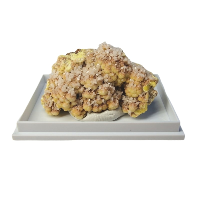 Zbierkový minerál Mimetesit+ Kalcit, ktorý je pripevnený lepiacou gumou.