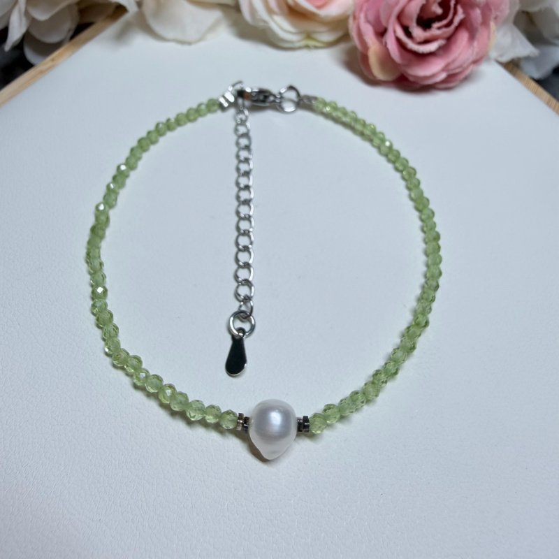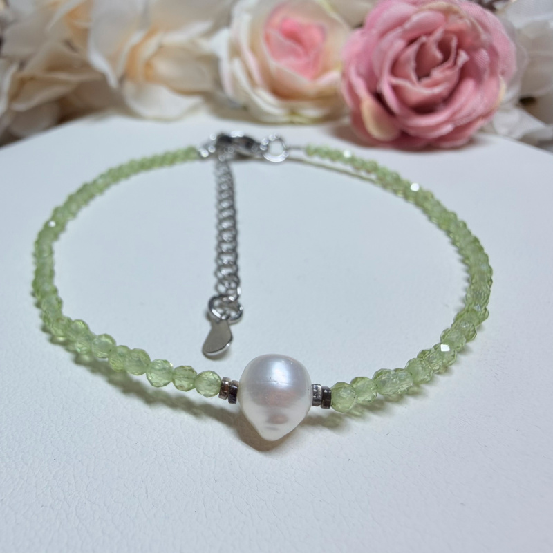 Olivín (fazetovaný) + Perla - náramok so zapínaním z chirurgickej ocele (gul. Ø 2 mm)