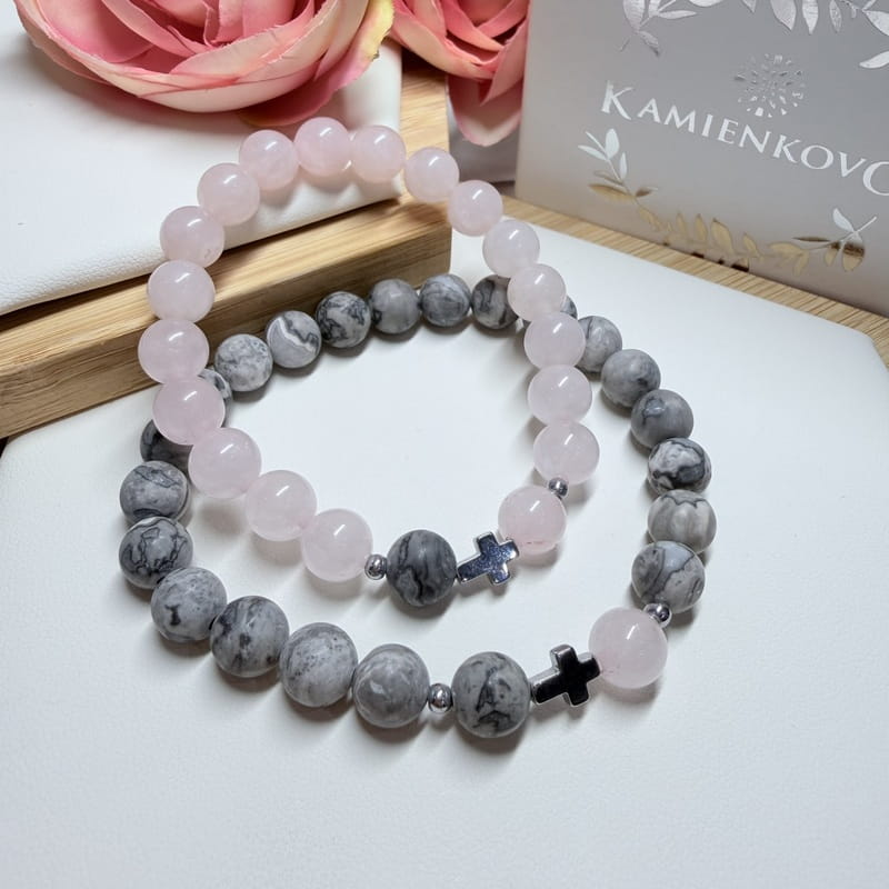 Ruženín + Jaspis sivý (matný) - PARTNERSKÉ náramky s krížikom (gul. Ø 8 mm)
