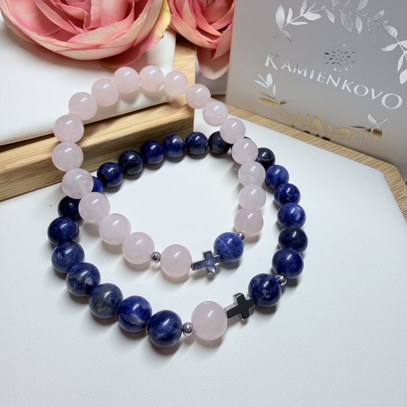 Ruženín + Sodalit - PARTNERSKÉ náramky s krížikom (gul. Ø 8 mm)