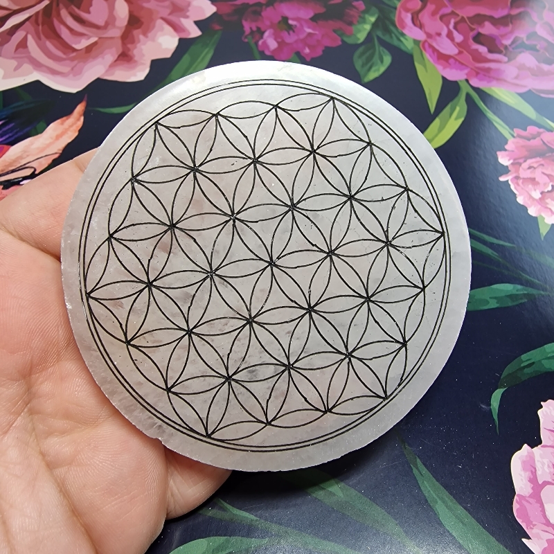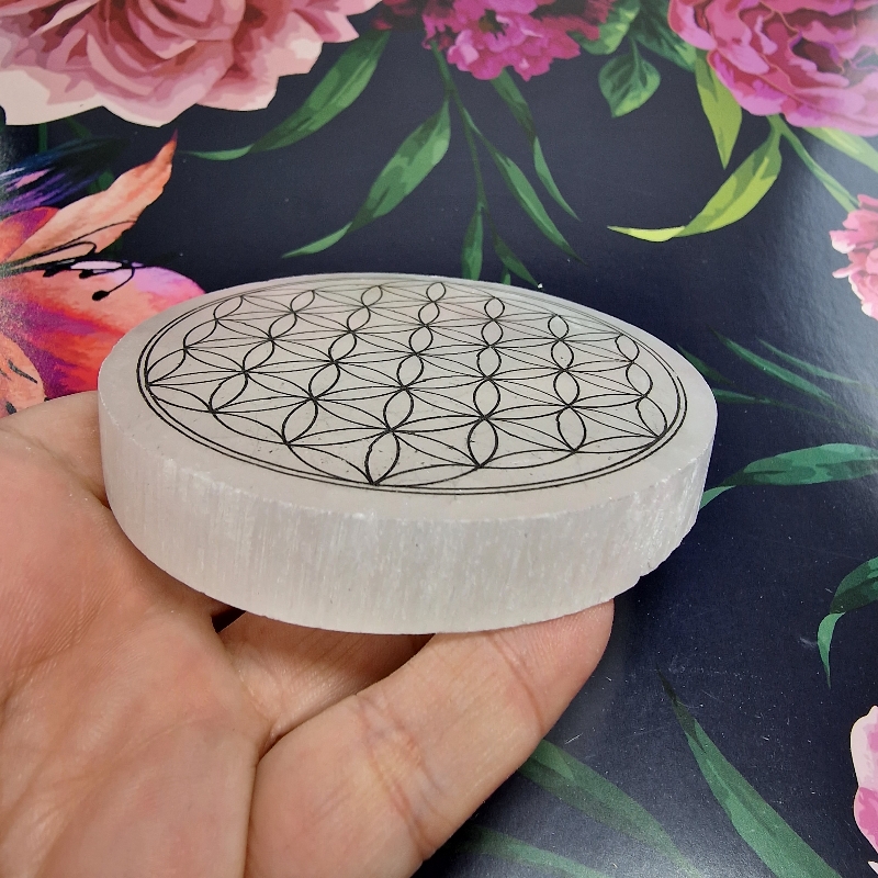 Selenit - podložka kvet života čierny (Ø 8 cm)