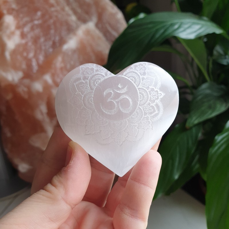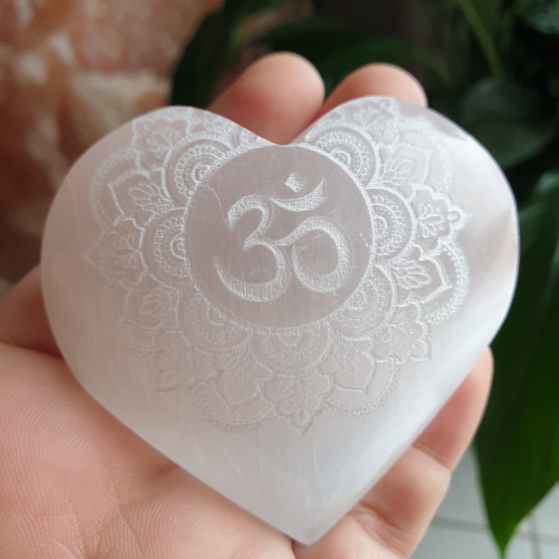 Selenit - srdce mandala+Óm (v: 6 cm)
