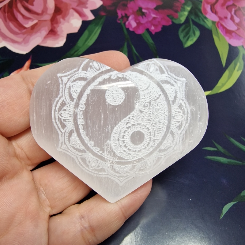 Selenit - srdiečko mandala + JING JANG (v: 6-7 cm)