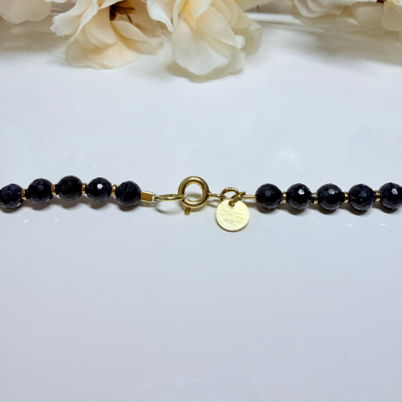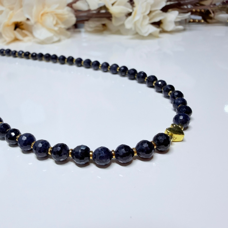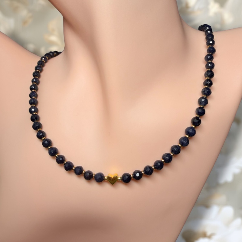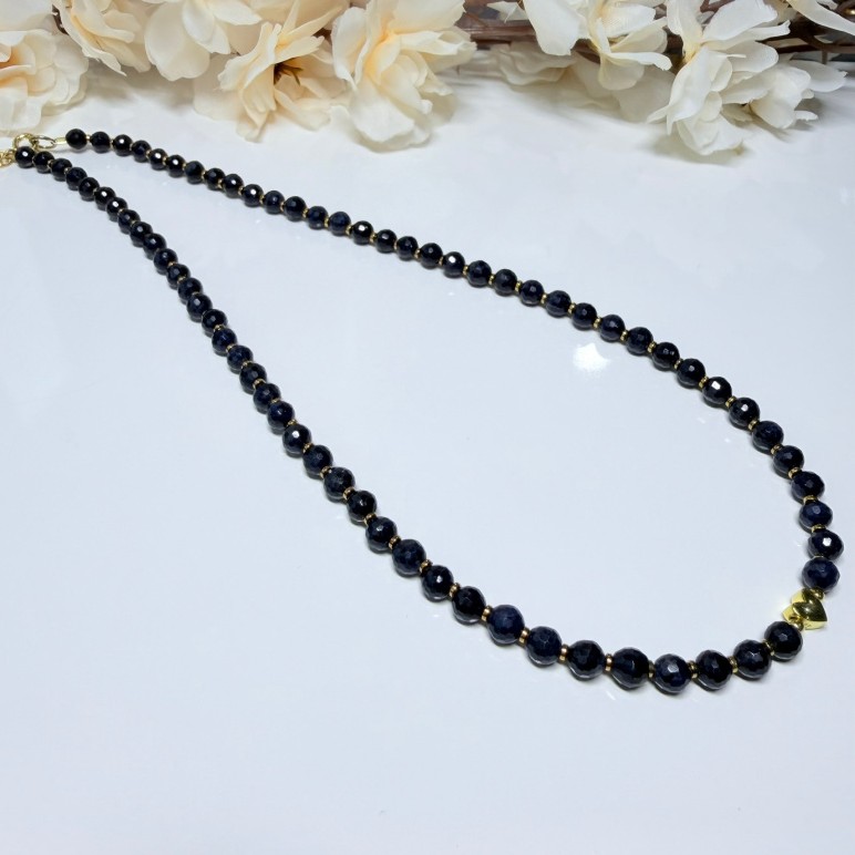 Zafír (fazetovaný) + Hematit (pokovený) - náhrdelník so srdiečkom 42.5 cm (Ø gul. 5 mm)