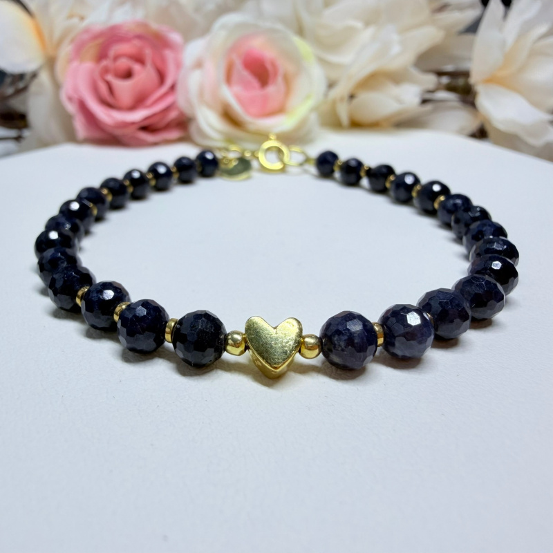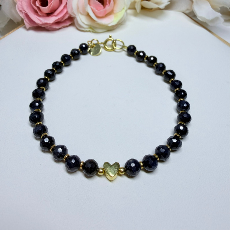 Zafír (fazetovaný) + Hematit (pokovený) - náramok so srdiečkom 17.5 cm (Ø gul. 5 mm)